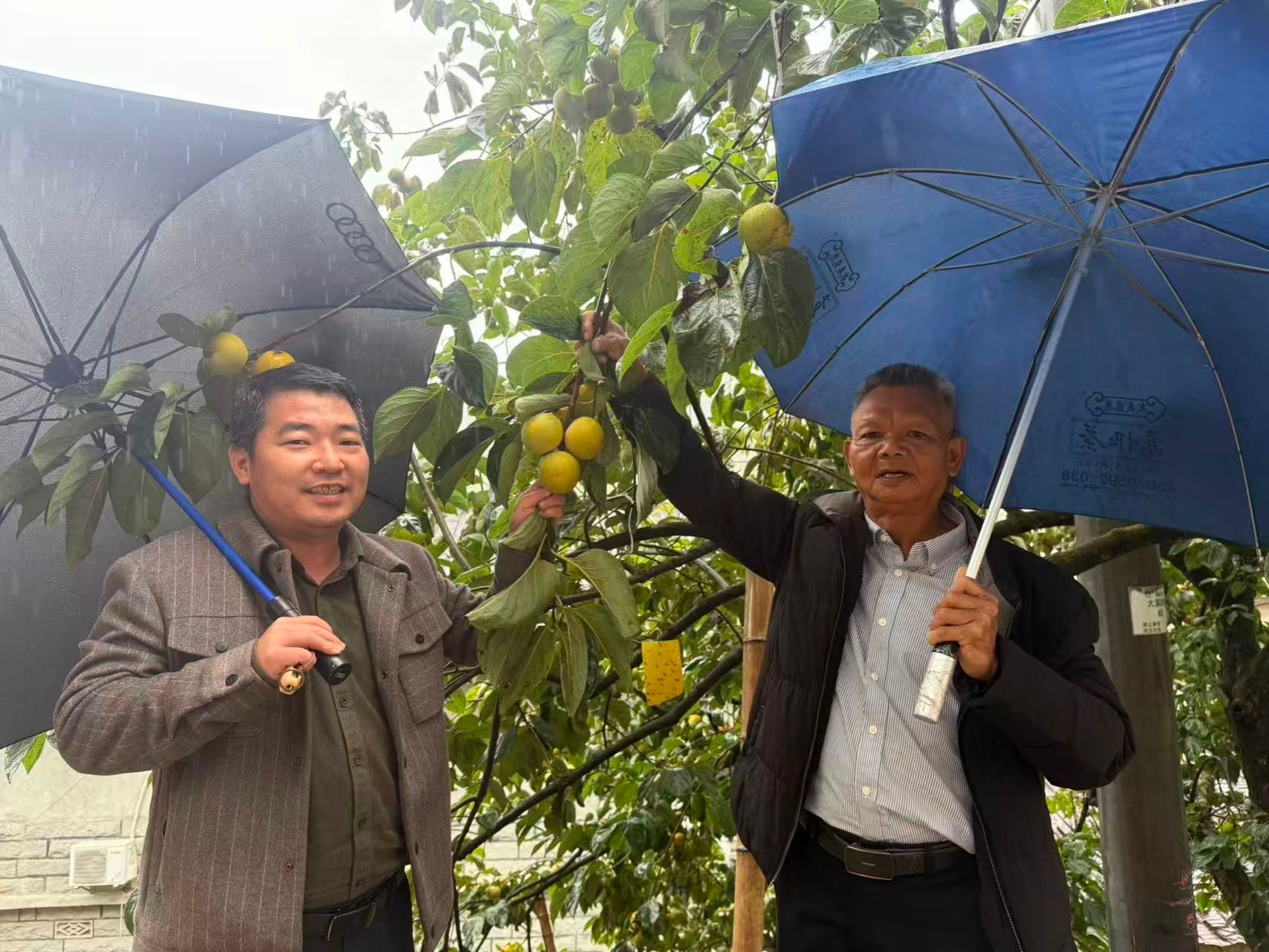 谢君铨老师首先走进果园,实地查看果实大小、色泽、饱满度等生长指标,与农场主深入交流,详细了解今年柿子长势、预估产量及日常管理中的突出问题。针对丰果期易出现的落果现象,他现场分析成因,从科学水肥调控、靶向病虫害防治等方面,提出一套切实可行的田间管理方案。